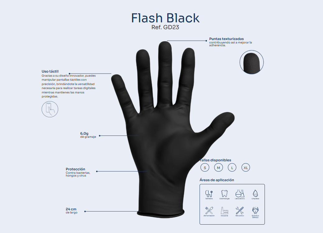Nuestros guantes técnicos de nitrilo negro están diseñados para ofrecer el más alto rendimiento en sectores que exigen resistencia, precisión y durabilidad. Con un gramaje de 6 gramos, son más gruesos y robustos que los guantes convencionales, proporcionando una protección hasta tres veces mayor frente a micro-orificios que los guantes de látex.